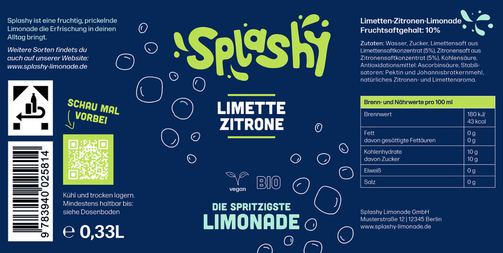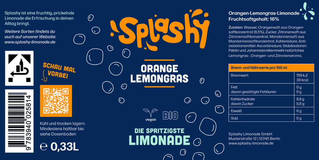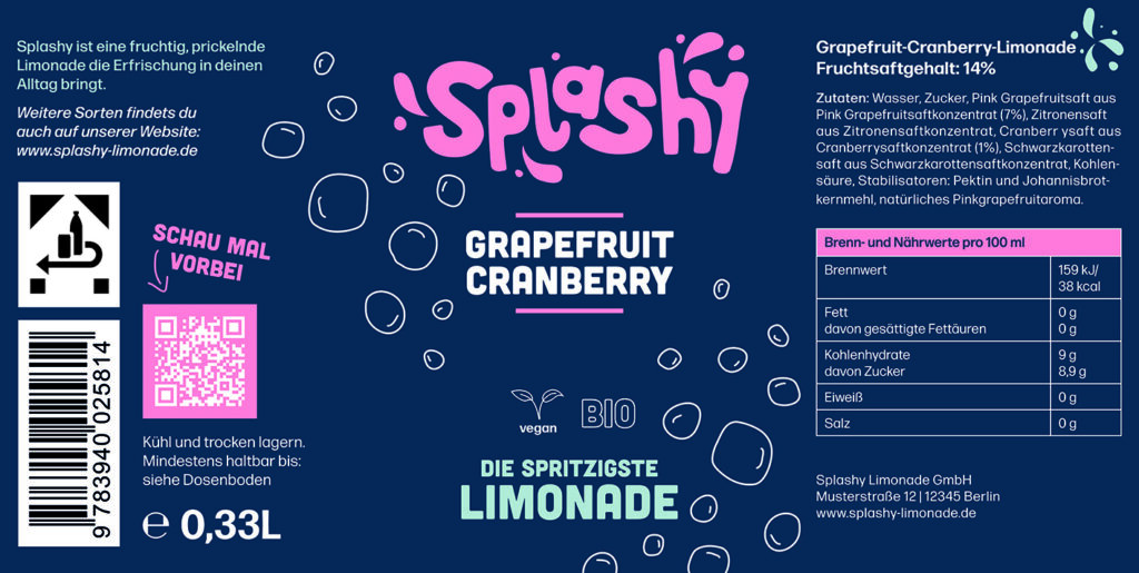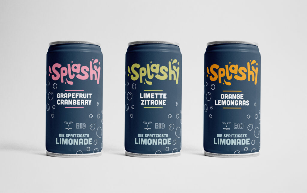 Splashy ist ein fiktives Projekt für eine spritzige Limonade im handlichen 0,33L-Dosenformat. Die drei Sorten – Grapefruit Cranberry, Orange Lemongras und Zitrone Limette – stehen für lebendige Farben, klare Typografie und ein frisches, modernes Markenerlebnis.